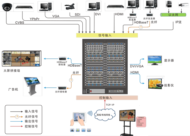 支持所有常用輸入/輸出信號卡,與HDMI,HDbaseT,SD/HD/3G-SDI,光纖,DVI和VGA(兼容YUV,YC及CVBS)可以任意輸入切換到任意輸出;